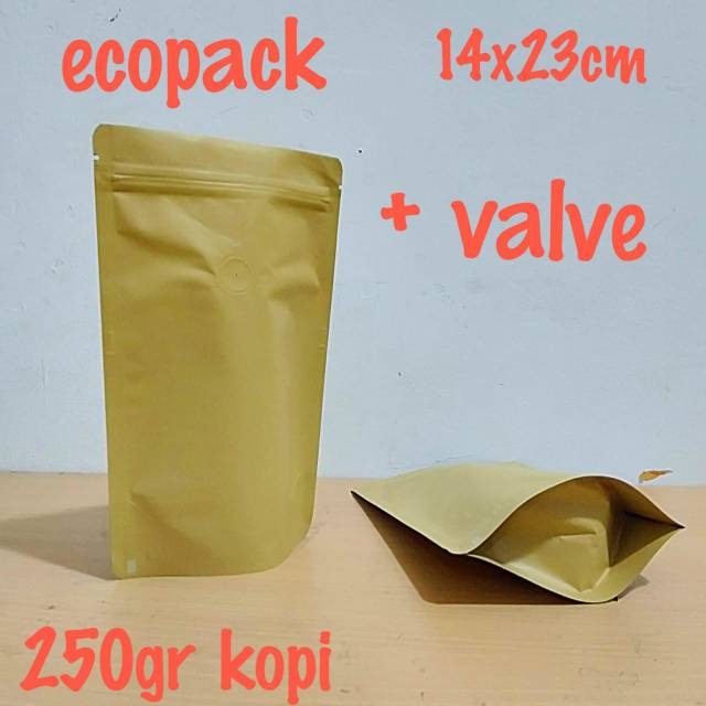 HARGA DIATAS UNTUK 100PCSKemasan ecopack luar kertas dalam alumunium foil 14x23 cm setara 250kopi atau 500gr gula dilengakapi dengan VALVE UNTUK SIRKULASI GAS YG DIHASILKAN KOPIHarga yang tertera adalah harga 100pcs ke