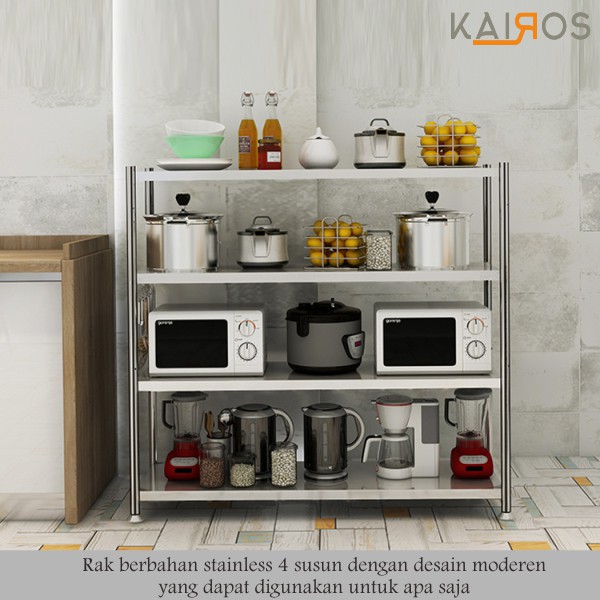 KR90 RAK MICROWAVE 4 SUSUNRak Dapur ini berfungsi sebagai tempat penyimpanan peralatan dapur seperti, panci, microwave, oven, dan lainnya. Sangat cocok diletakkan di dapur menjadikan tampak lebih rapih, dan hemat ruang. Rak berbahan stainless steel aman digunakan dan lebih tahan lama.SpesifikasiMaterial : Stainless SteelReady Stock : SilverUkuran : 68 x 33 x 130 cmKegunaan : Penyimpanan Peralatan DapurKelebihan:-Terbuat dari stainless steel yang tahan karat-Palet cukup tebal pada tiap lapisan-Kokoh dan kuat menahan beban berat-Mudah dibersihkan-Cocok digunakan di dapur, ruang tamu, ruang makan, dan lain lain.-Mempunyai jarak yang lebar setiap susunan-Mempunyai 4 roda===============================================KAIROS Home & LivingWaktu Operasional : Senin - Sabtu, Jam 08.00 - 17.00 WIBWaktu Pengiriman : Senin - Sabtu, Jam 08.00 - 15.00 WIB*Dapat melakukan Pemesanan Hari Minggu dan Hari Libur, namun barang dikirim pada hari kerjaCatatan:- Variasi pesanan yang habis, jika tidak ada konfirmasi dari pembeli akan dikirim random.Happy Shopping ❤️❤️#rakdapur #rakmicrowave #rak4