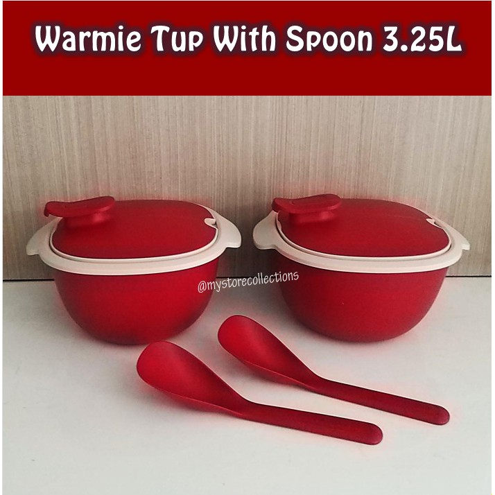 3,25L Warmie Tup with Spoon (1 Pcs)Ukuran:3.25 L / d. 24 ; t. 13.5 cm (without cover) t. 17.5 cm (with cover) Momen istimewa kumpul keluarga di hari yang spesial harus dipersiapkan dengan baik agar momen tersebut tak terlupakan. Untuk itu, Anda harus memilih wadah yang tepat agar hidangan yang disajikan akan tetap hangat lebih lama saat disantap. Tupperware menghadirkan piranti saji yang lengkap, yaitu Warmie Tup 3.25L with Spoon yang cantik dan akan menjaga makanan hangat lebih lama sehangat kumpul bersama keluarga.Fitur Warmie Tup 3.25L with Spoon :1.Dengan fitur Double Walled yang dapat menjaga suhu makanan tetap hangat 90 menit lebih lama.2.Dilengkapi dengan cover dan dapat ditutup dalam 2 posisi (dengan sendok di dalam atau tanpa sendok di dalam).3.Memiliki 2 fungsi, yaitu reheat (menghangatkan dalam microwave) dan serving (menyajikan hidangan di meja makan).4.Cover dapat digantung pada bagian samping Bowl.Keistimewaan:•Ukuran yang beragam, sehingga lengkap untuk menyajikan berbagai makanan.•Dilengkapi dengan sendok yang memudahkan Anda untuk mengambil makanan. •Semua bagian Warmie Tup dapat dibuka, sehingga mudah dibersihkan.•Hemat tempat saat disimpan.•Tampilan desain dan warna yang modern dan cerah sesuai dengan gaya interior rumah modern masa kini.•Terbuat dari bahan khusus sehingga produk ini dapat untuk menghangatkan makanan di microwave.•Material bahan bagian luar tidak licin, sehingga tidak mudah meleset saat dipegang.NB: MOHON TANYAKAN KETERSEDIAAN BARANG TERLEBIH DA