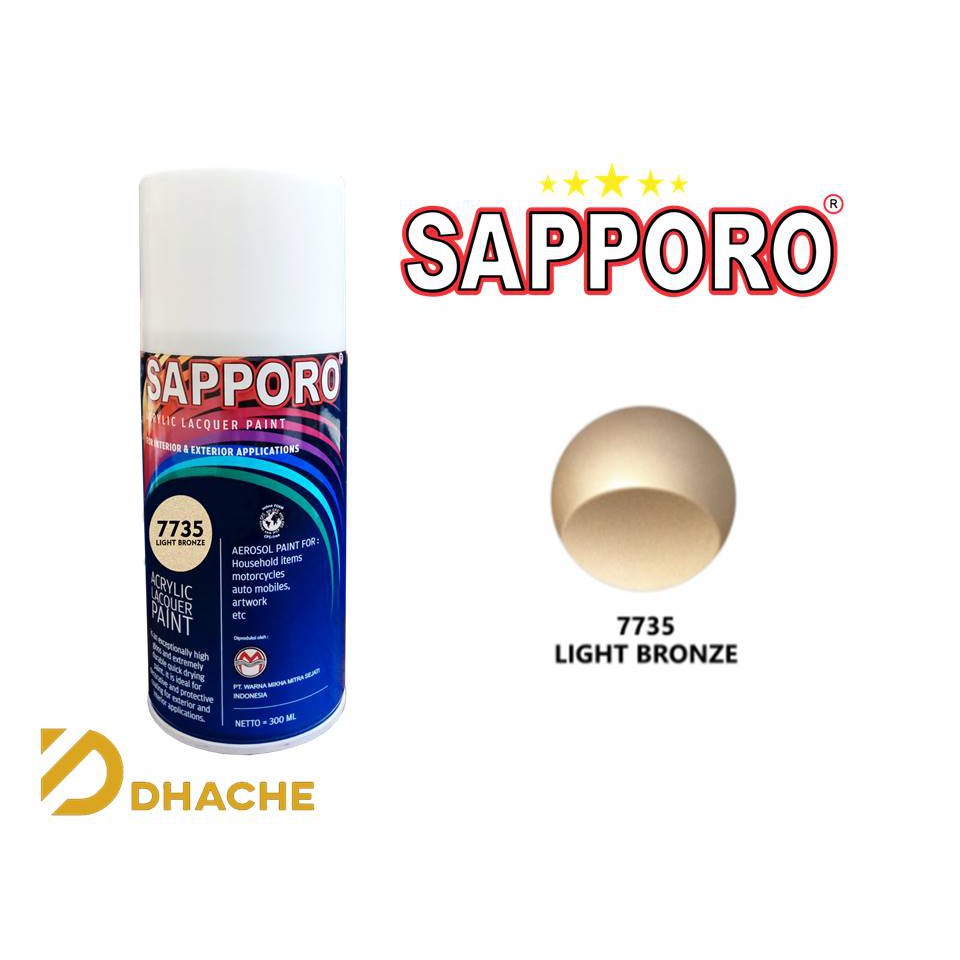 Warna: Lihgt BronzeNo part: 7735Isi: 300mlCat Aerosol SAPPORO adalah cat semprot akrilik dengan kualitas terbaik digunakan untuk permukaan metal, plastik dan kayu. Cocok buat kamu yang pengen cat ulang helm, velg, plat nomor atau body motor biar lebih keren, gaul, dan kekinian.METODE PENGECATANDaya sebar teoritis 1,5 m2 / kalengKocok kaleng selama 15-30 detik, sampai kaleng dalam keadaan terasa bergetar bebas.Pegang kaleng tegak dengan jarak 25-30 cm dari permukaan, semprot dengan gerakan horizontal hingga terbentuk lapisan cat yang tipis dan rata.Kocok kaleng secara berkala selama penggunaan.Semprot 2 atau 3 lapisan tipis dengan jarak aplikasi sekitar 10 menit akan memberikan hasil optimal.*NOTE:1. Mohon hubungi kami via chat untuk check stock terlebih dahulu, atau apabila Anda mengalami kesulitan dalam proses pengecatan.2. PENGIRIMAN LUAR PULAU JAWA silahkan chat terlebih da