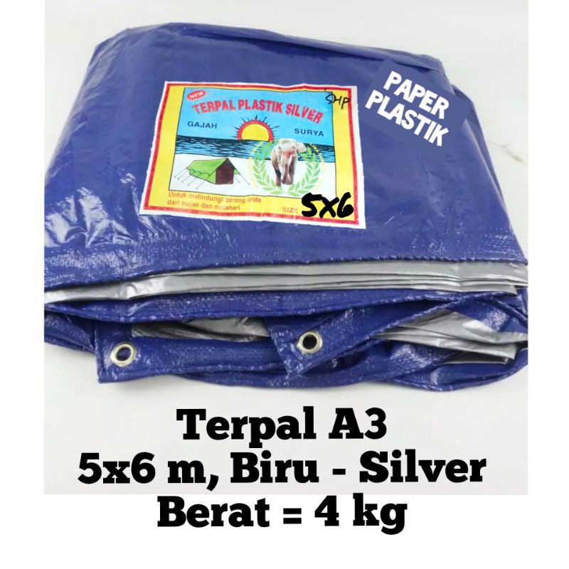 Terpal 5x6m SilverTebal : A3Model : jadianmerek : GAJAH SILVERSudah ada lubang di pinggir2 utk taliWarna : 1 sisi biru, 1 sisi silverTerpal multi fungsi , cocok di gunakan untuk berbagai macam keperluan, misalnya:- Keber warung , penutup warung- Atap tenda- Penutup bak truck, bak pick up.- Alas lesehan, alas piknik - Alas tanah bak ikan- Penahan angin kandang ternak- Alas jemuran jagung, gabah- Pelindung bibit tanaman, bunga- Alas pengecoran- DllHappy shopping.....#terpalplastik #terpalkolam #terpalsilver #terpalbiru #terpal5x6 #terpal5x6m #ter