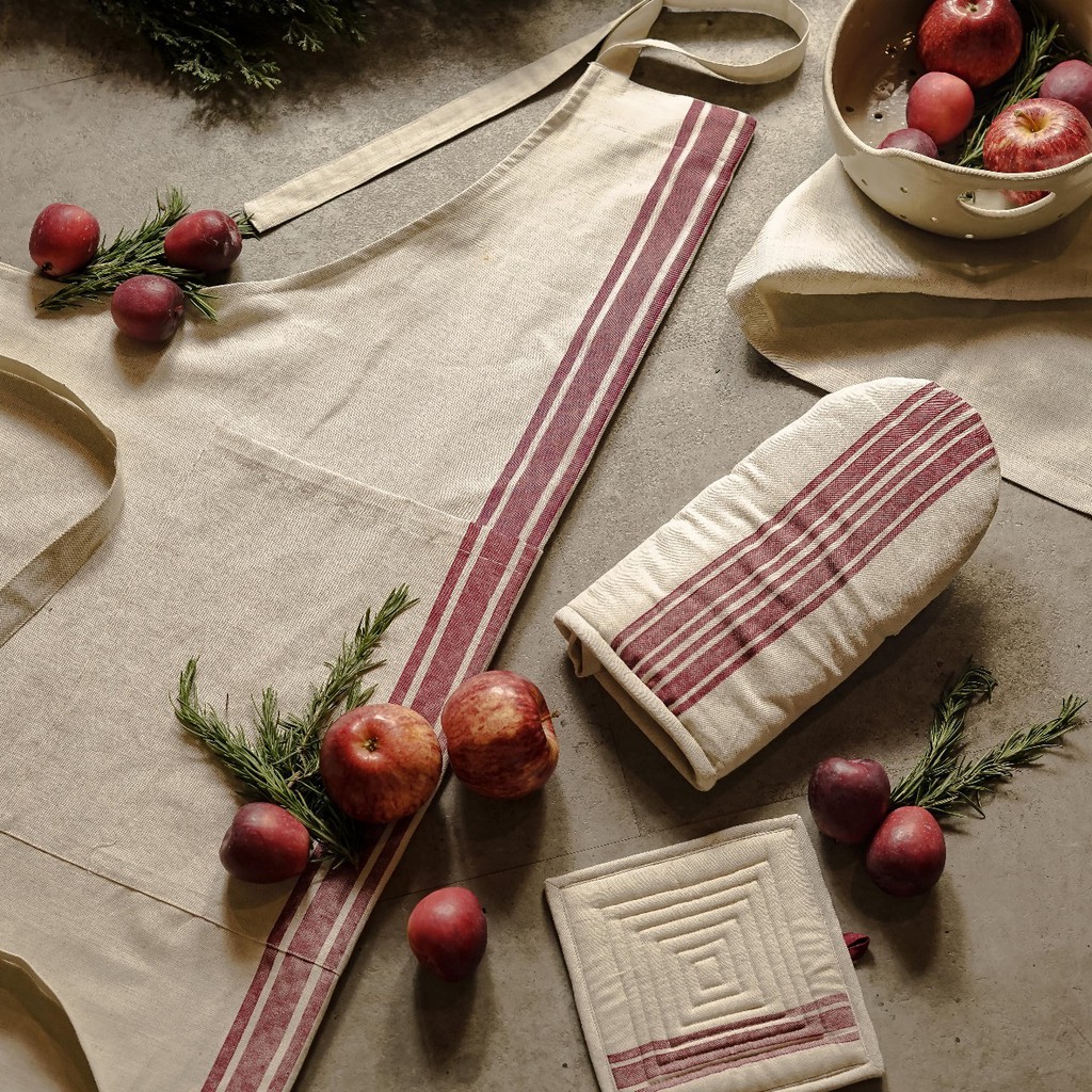 Materials 80% Cotton 20% Linen APRON SIZE GUIDE Free size (Length 95 cm)MITTENS SIZE GUIDE 15 cm x 27 cmPOT HOLDER SIZE GUIDE16 cm x