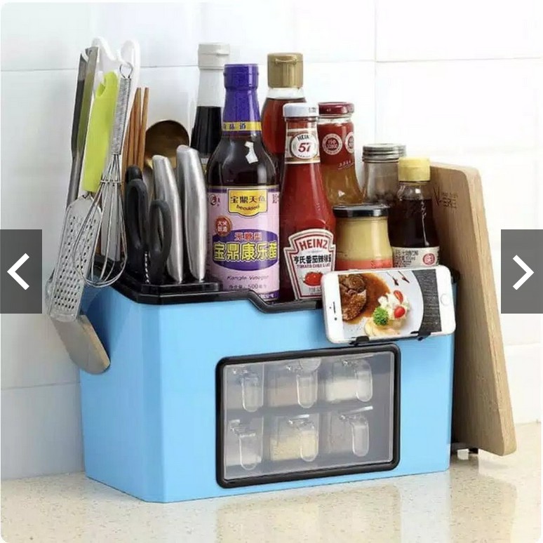 Rak bumbu daput set dengan gantungan sampingUkuran 34x19x22 cmSulit membereskan bumbu dapur?Rak bumbu dapur ini membuat penampilan dapur anda lebih rapihdengan ukuran yang pas dan berbagai sekat yang memiliki banyak fungsiRak bumbu dapur serbaguna yang dapat digunakan untuk menyimpan bumbu dapur.Komplit dengan gantungan kitchen utensils dan tempat untuk pisau sendok garpu / sumpit. Serta 6 laci