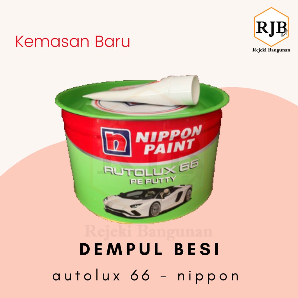 Deskripsi Dempul AUTOLUX 66 PE Putty 1 KG / Dempul Plastik Besi Kayu Fiber MobilJenis : Autolux 66 PE Putty (produk Nippon Paint)Ukuran : 1 kg (base) + 20 gr (hardener)Sangat cocok diaplikasikan pada mebel, motor, mobil, bis, kereta api, tangki fiber, kapal fiber, pintu kayu, dan lain-lain.AUTOLUX 66 PE PUTTY adalah dempul 2-komponen yang terdiri dari base dan hardener dengan base berupa resin polyester pilihan. Dempul ini dapat dipakai secara langsung di atas permukaan logam di mana lapisan yang terbentuk sangat tebal pada satu kali aplikasi. Dempul ini mempunyai daya adhesi yang baik, permukaan yang halus, mudah digunakan dan diamplas.Bisa juga digunakan untuk permukaan kayu jika dilapisi dengan Nippe 2000 EP Primer Surfacer atau Nippon Hi-Epoxy Filler.Aplikasi Data :- Aplikasi : Kape dan sekop- Umur Campuran : 5 menitWaktu Pengeringan :- Kering Sentuh : 5 menit.- Kering Keras : 2 jam.- Pengamplasan : 5 jam.Cara Penggunaan :1. Hilangkan cat lama, karat, sisa kerak oli, debu, air dll sampai bersih benar.2. Aduk dempul dengan hardener sampai rata (perbandingan standar antara dempul dan hardener adalah 100:2 menurut berat).3. Gunakan adukan dengan kape dalam waktu 3-5 menit pada suhu 30 derajat Celcius tergantung pada suhu dan kelembaban.4. Apabila ada permukaan dempul yang ada timbul/tidak rata, dapat dilakukan pengamplasan agar rata. Pengamplasan dilakukan harus setelah dempul kering keras! (sekitar 5 jam pada suhu 30 derajat Celc